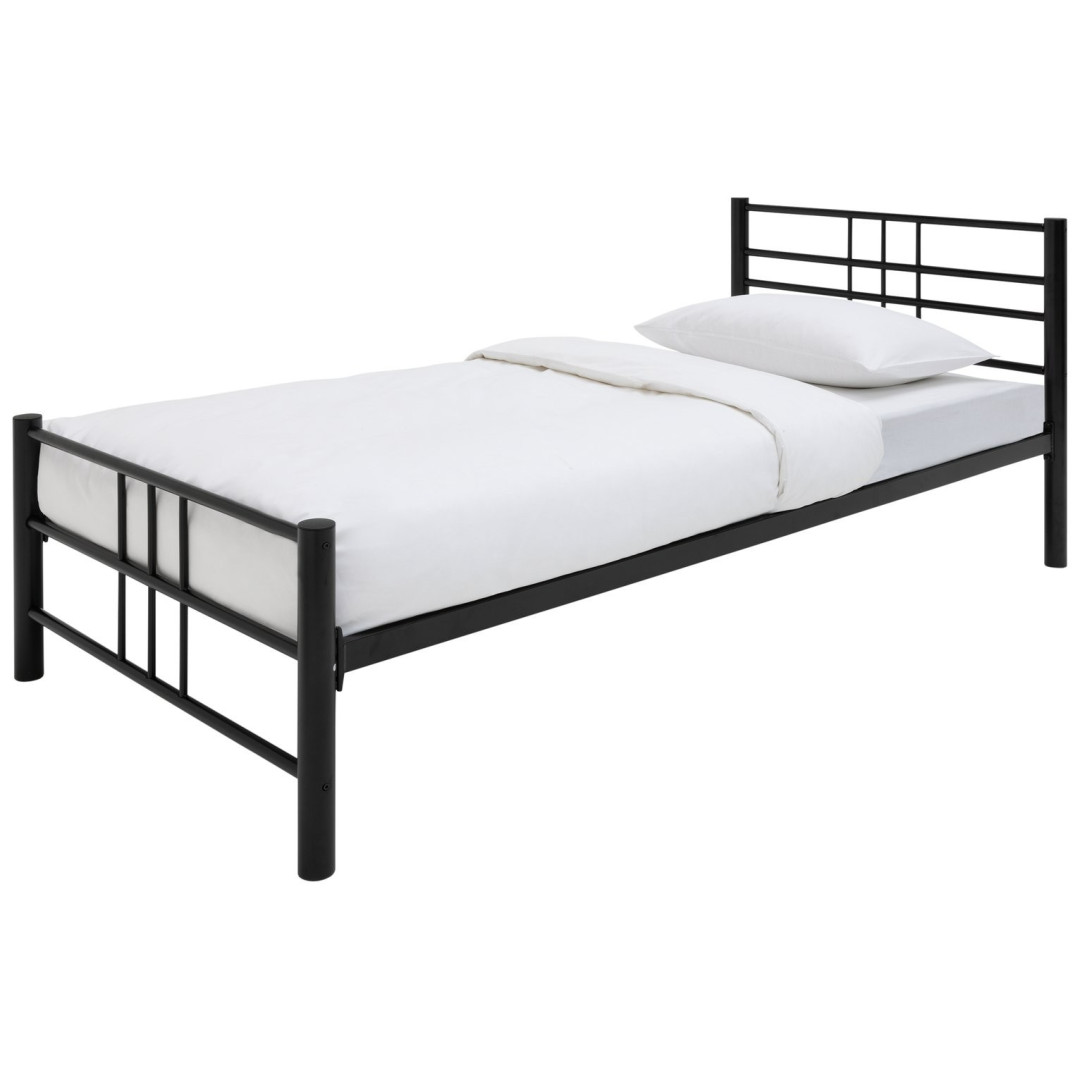 Say hello to Atlas, our smart metal bed frame. In black powder coated steel, the contemporary linear design creates a distinctive header and footer. Plus, metal slats provide firm support for a single mattress. Dress with white bedlinen for a clean classic look.