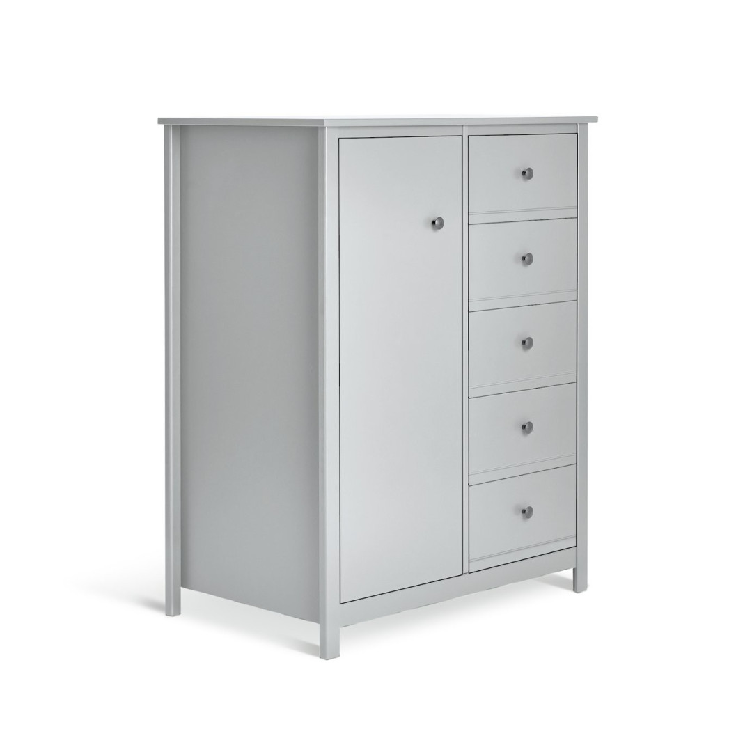 Features 1 door. 5 drawers with metal runners. 1 fixed hanging rail.