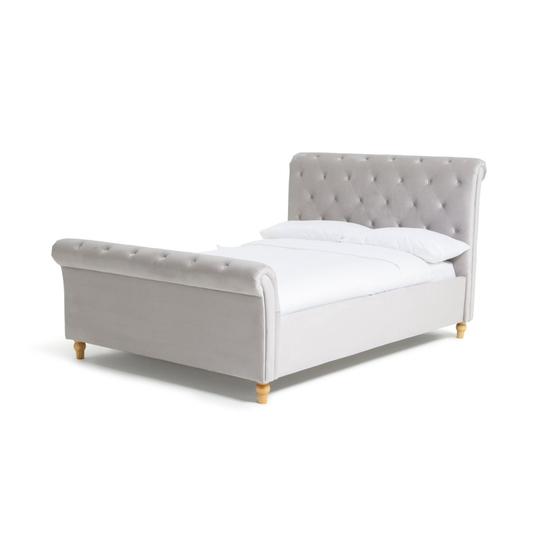 A little bit of pampering does us good. Go to bed and feel like sleeping beauty in our gorgeous sleigh frame. Beautifully upholstered and finished by hand in a tactile soft grey velvet with extra deep buttoning on the gently scrolled headboard, Harrogate will transform your bedroom. With sprung wooden slats for mattress support and ventilation, and turned, wooden legs. Our 5 feet Harrogate bedframe is an easy way to add quality, richness and luxury to your bedroom.