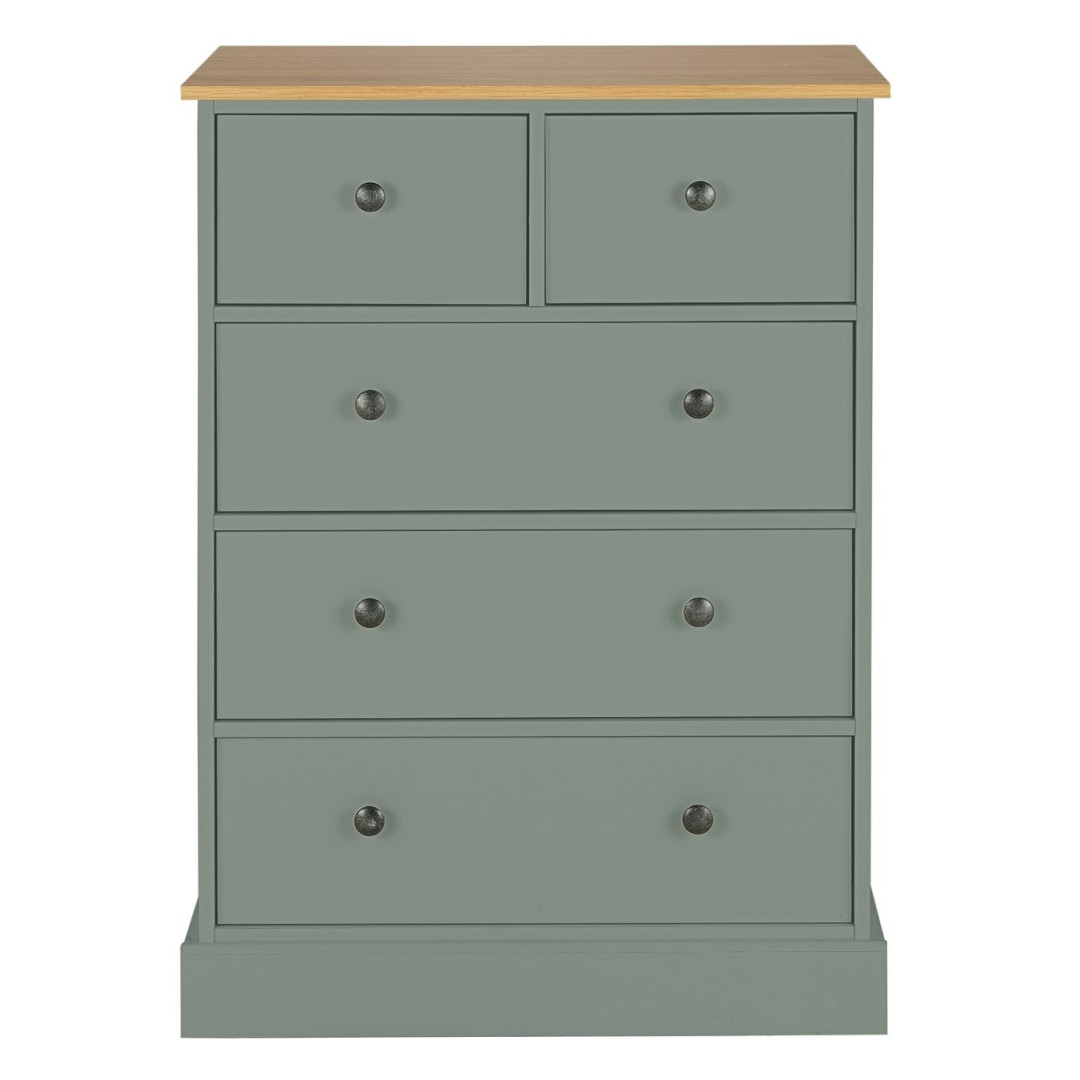 The Kensington 5 Drawer Chest gives you tidy storage for clothes and linen without taking up much floor space. Its sage finish and oak-effect top bring a traditional look to your bedroom, while five drawers provide plenty of room for folded items. The metal handles add a contrasting touch and make opening drawers straightforward. It's made in the UK with a decorative plinth that wraps around the base. Part of the Kensington collection, so you can match it with other pieces.