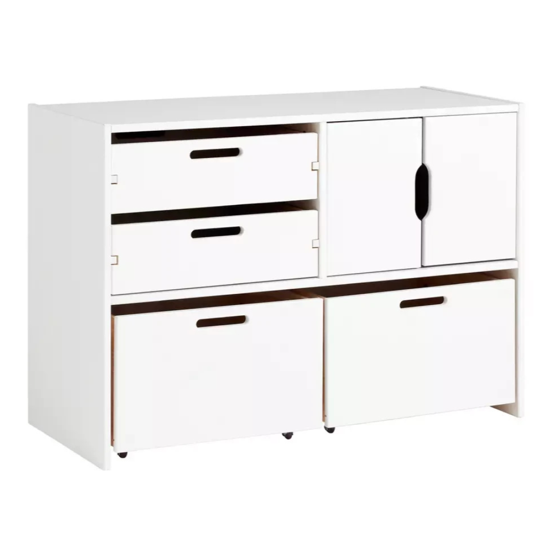 This double storage unit combines 2 drawers with a cupboard and 2 good sized trundle drawers. The cut-out handles give a streamlined Scandi vibe, and the wooden runners and sturdy castors add a traditional finish. Matching items available. Our products are designed with kids in mind and are built to cope with everyday use. Tested to the latest safety regulations, they comply with British and European safety standards.
