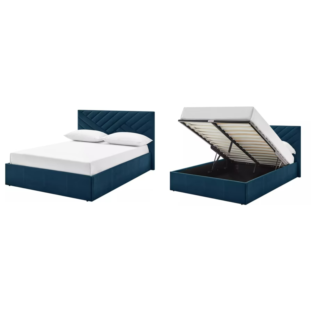 Lovely Luca. This glam bedframe is a stunner with its richly coloured plush velvet upholstery and herringbone-style ribbed headboard. Lots of character here. Simply lift the end to reveal plenty of hidden storage underneath. Ideal for tucking away seasonal clothes and spare linen. And rest assured, it's made with sprung wooden slats to comfortably support and ventilate your mattress.