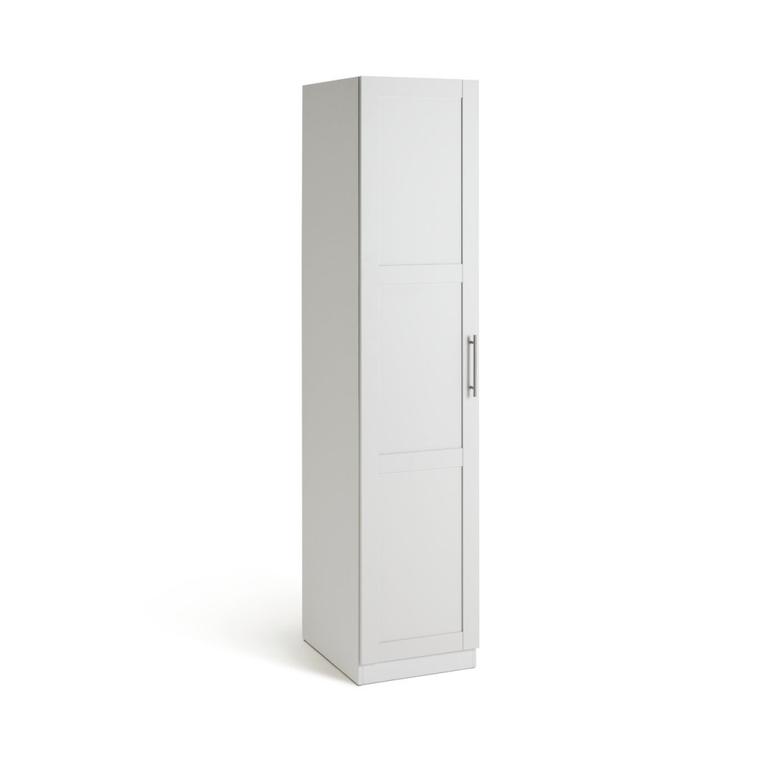 Need to squeeze in more room for your clothes? Here's a tidy solution. This compact 1 door wardrobe has 2 compartments for hanging shirts, skirts, jackets and jeans. Plus 1 shelves for shoes and bags. In pristine white, it has a clean, minimalist look. Ideal for contemporary living. Fitted with subtle, steel handles for a streamlined finish. How very cool.