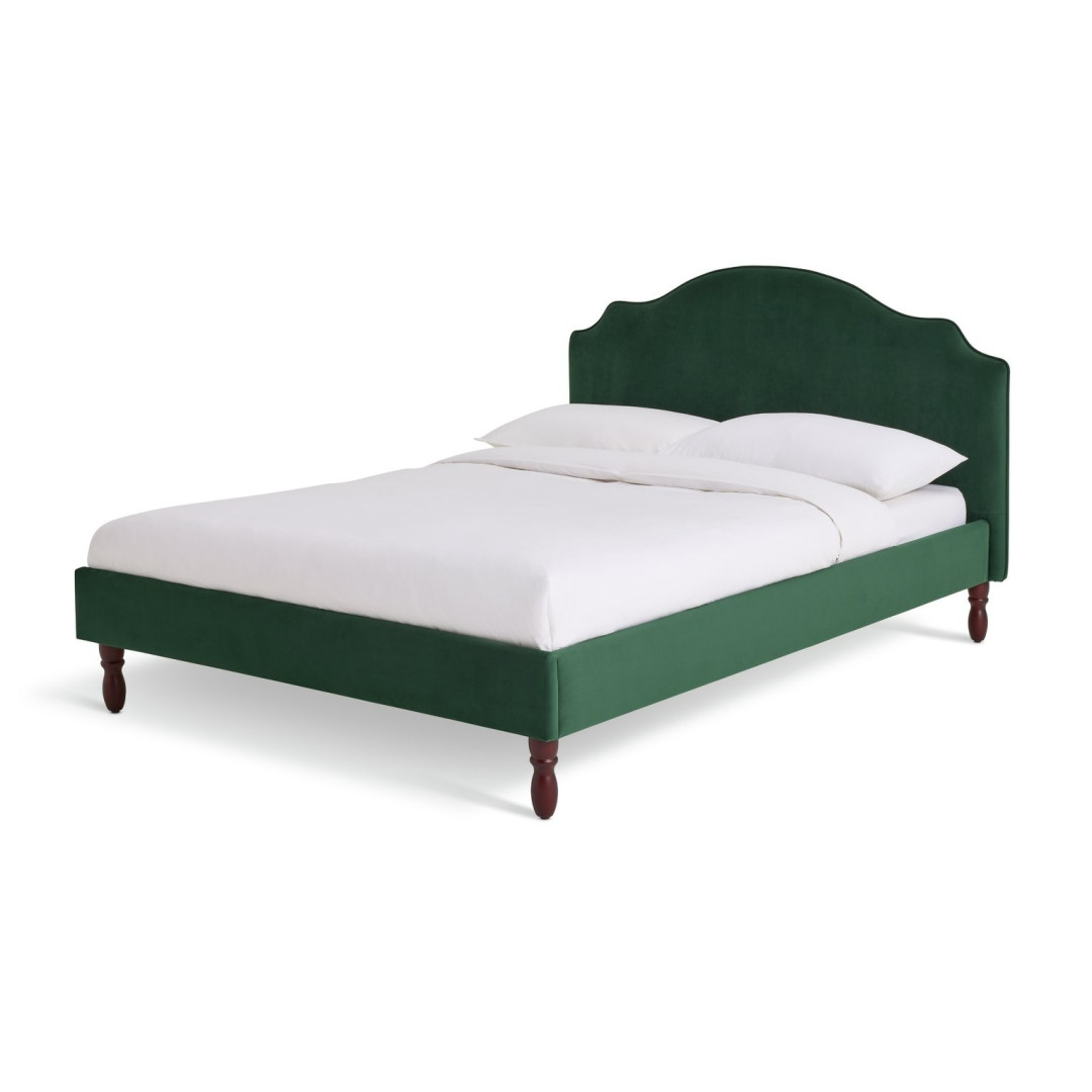 The Sophia is a beautiful kingsize bed frame. The wave shaped headboard in sumptuous moss green velvet has been hand upholstered by skilled craftsmen. Definitely a bold statement piece for the bedroom.